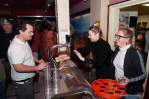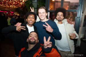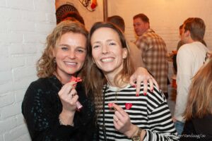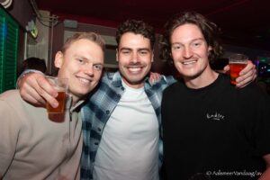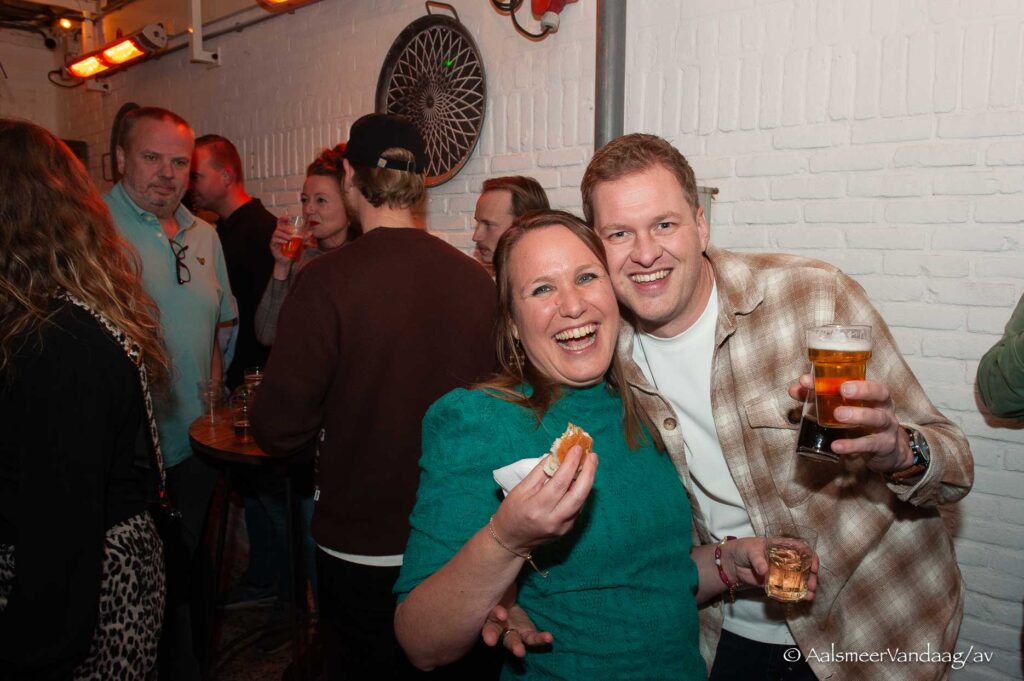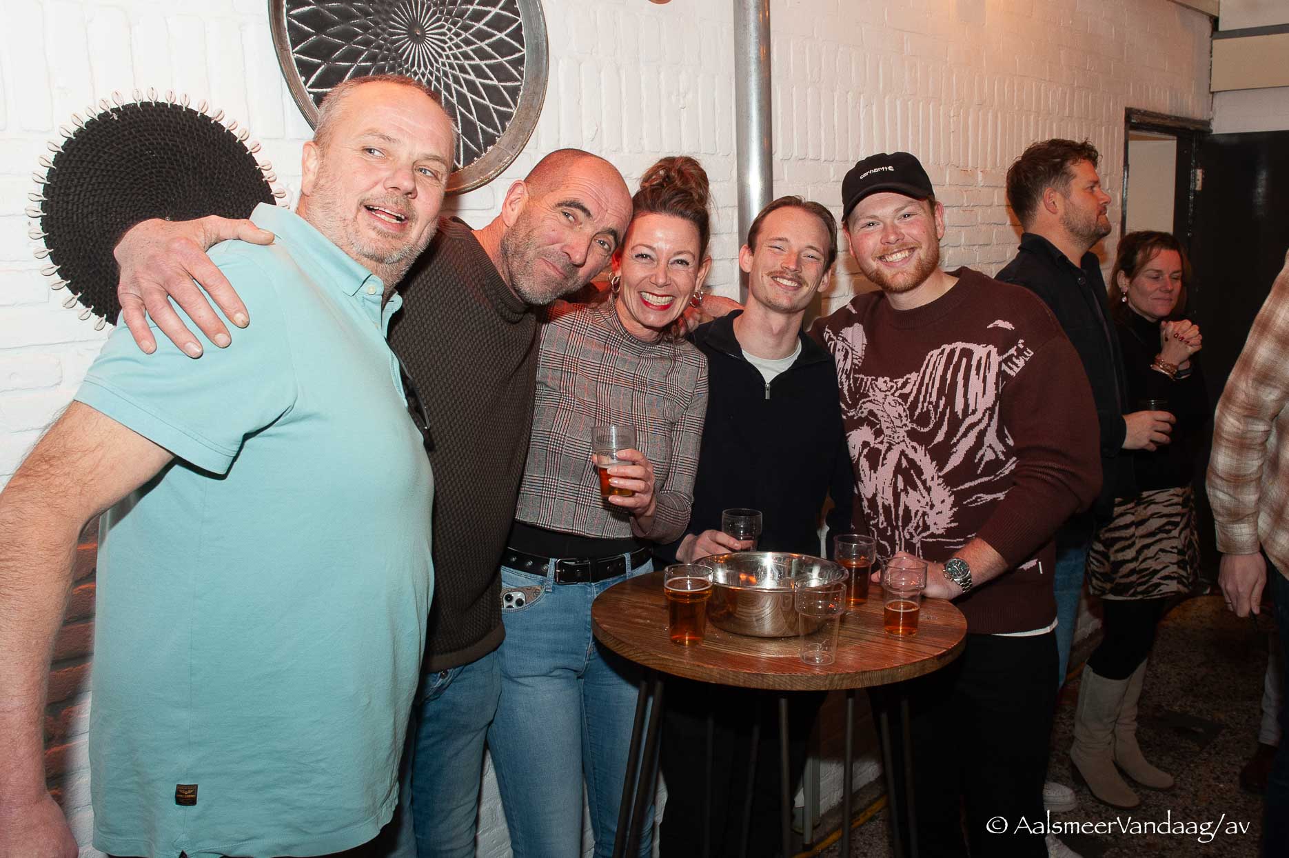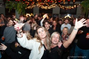 Of bij De Oude Veiling waar een deejay voor extra sfeer zorgt. Die is hier ronduit uitbundig. De vrolijkheid spat er vanaf terwijl de goed gevulde glazen in grote hoeveelheden voorbijgaan. Als de deejay vraagt of iedereen even tegelijk wil poseren voor de foto, gaan alle handjes spontaan de lucht in.
