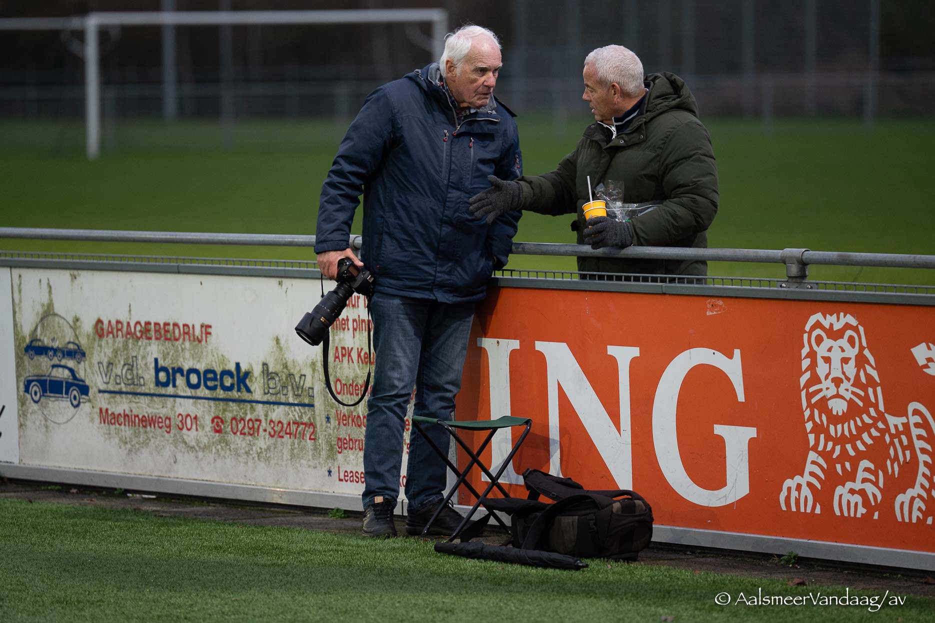 Deze week is het onze fotograaf Jaap Maars die zich geheel vrijwillig heeft opgeworpen tot mikpunt van uw spitsvondige verzinsels. Hier ziet u hem in een onderonsje met Hans van der Linden, een van de mannen van de Businessclub van FC Aalsmeer en verantwoordelijk voor de zakelijke artikelen die elke vrijdag op AalsmeerVandaag verschijnen. Wij zijn zoals altijd benieuwd waarover zij spreken zo langs de lijn bij de plaatselijke FC. We geven geen hints, u mag het helemaal zelf uit uw duim zuigen.