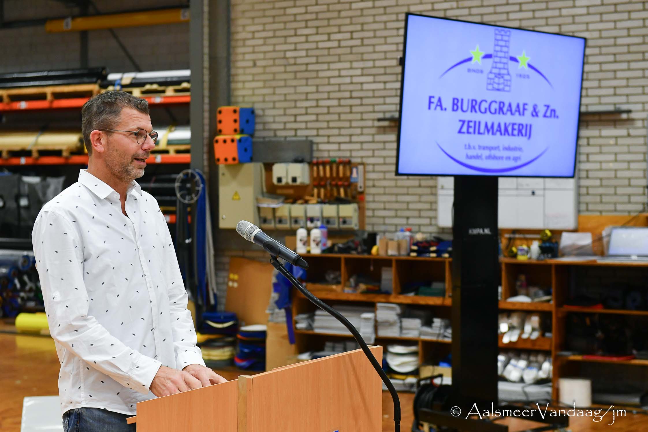 Bart Burggraaf, huidige directeur/grootaandeelhouder, schetste vervolgens de geschiedenis van het bedrijf. De oorsprong ligt in 1925 in Den Hoef, waar overgrootvader Gerrit Burggraaf zijn werkzaamheden als transporteur beëindigde en begon te handelen in jute zakken. Later stapte het bedrijf over op katoen en uiteindelijk op PVC voor de industriële zeilmakerij.