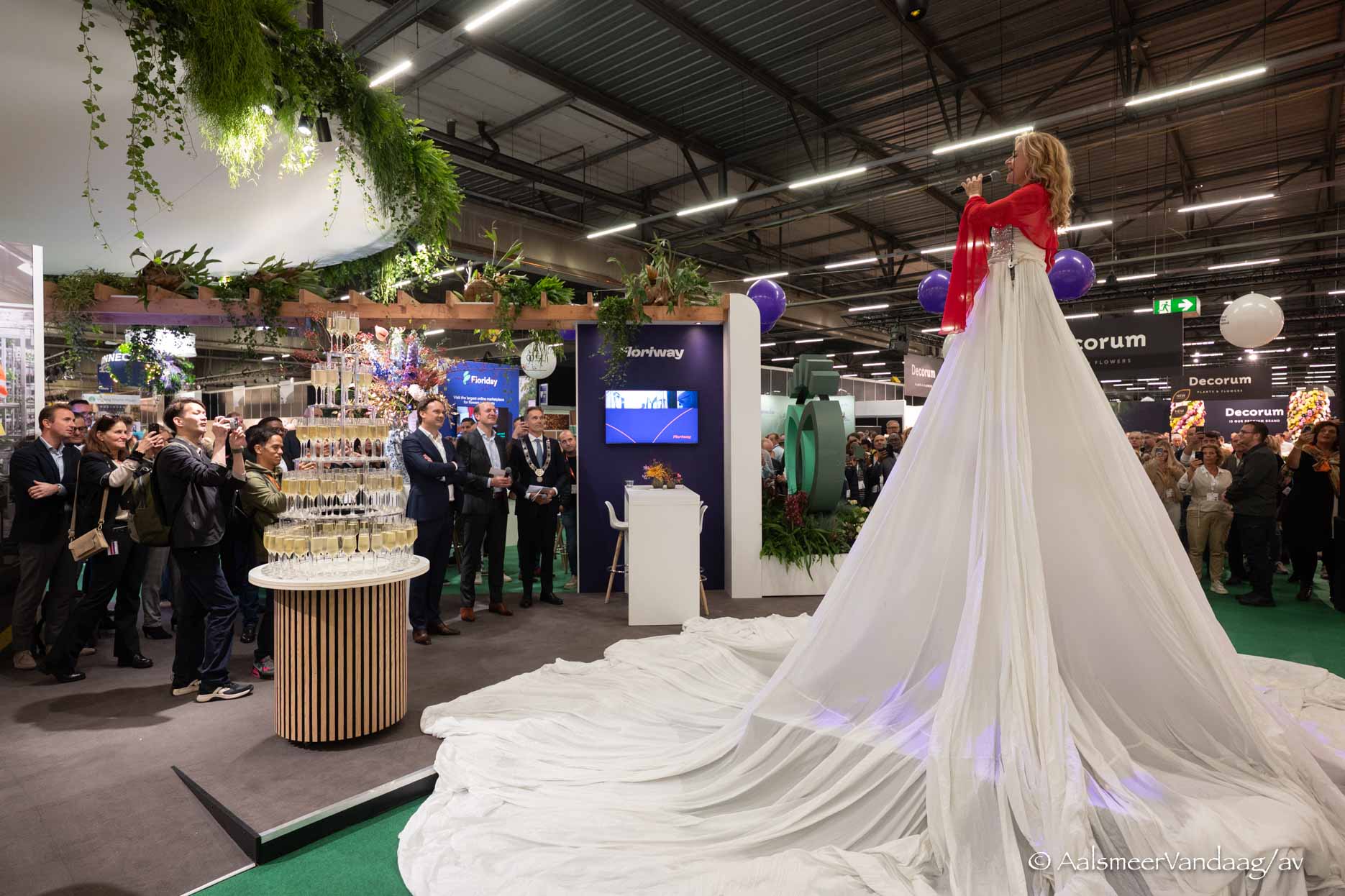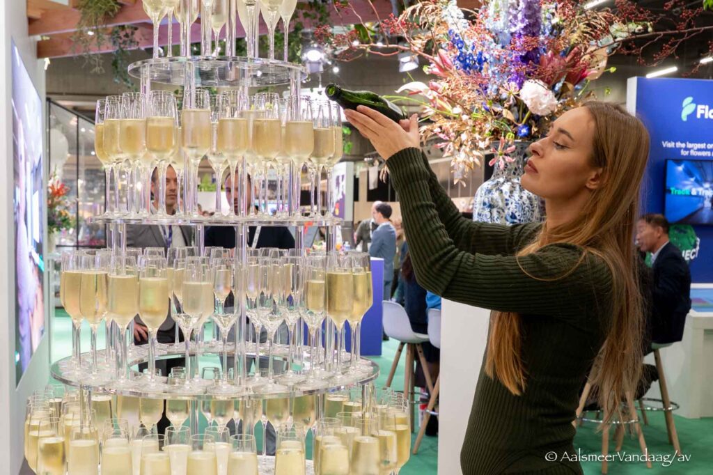Door: Arjen Vos. Vandaag ging op de tweede verdieping van het Royal Flora Hollandgebouw de 25e editie van de Trade Fair Aalsmeer van start. Hiervoor is 25000 vierkante meter veilingvloer ingericht waarop plaats geboden wordt aan meer dan 600 standhouders uit twintig landen. Het jubileum werd rond het middaguur feestelijk opgeluisterd met een spectaculair optreden, een toost en het overhandigen van een geschenk.